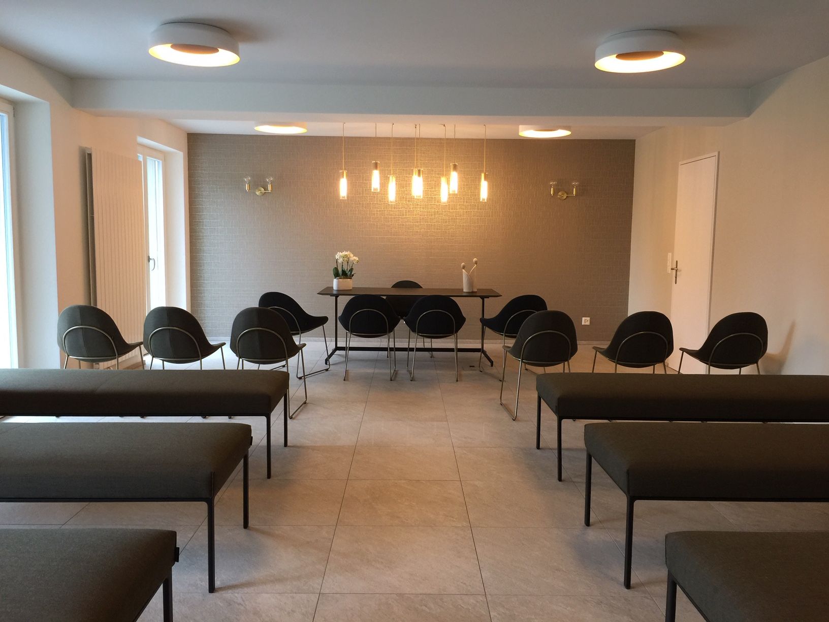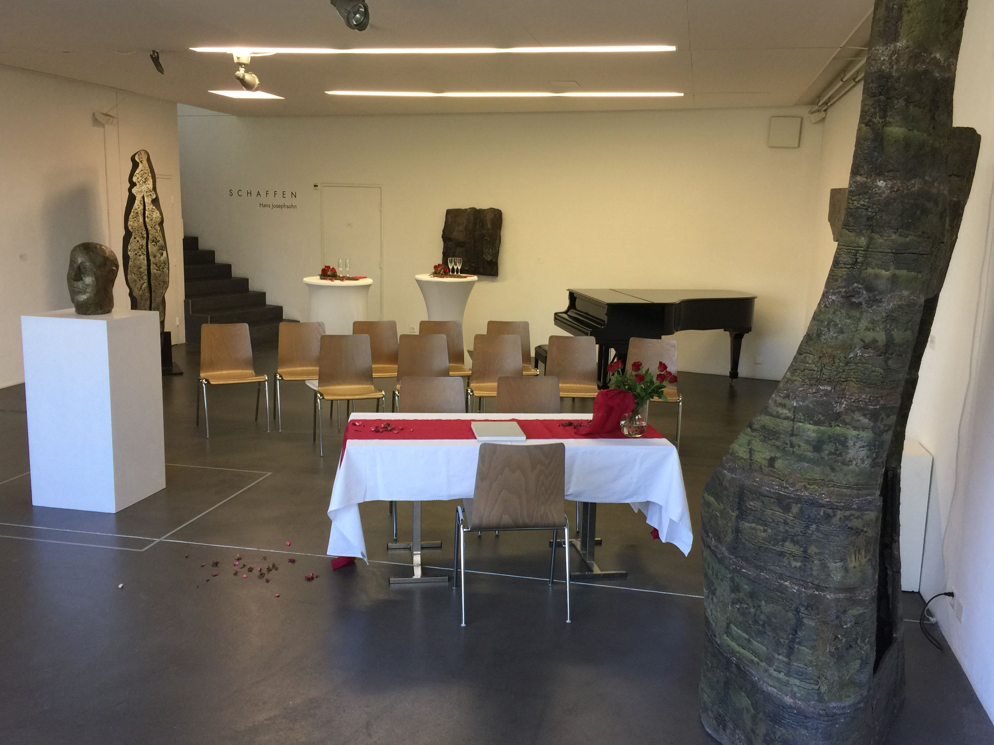 einen Trauungsraum im Rehmann Museum im Schimelrych 12 in Laufenburg (bietet Platz für 50 Personen, mit Steinway-Flügel, mit Zugang zum grosszügigen Skulpturengarten, vollständig rollstuhlgängig)