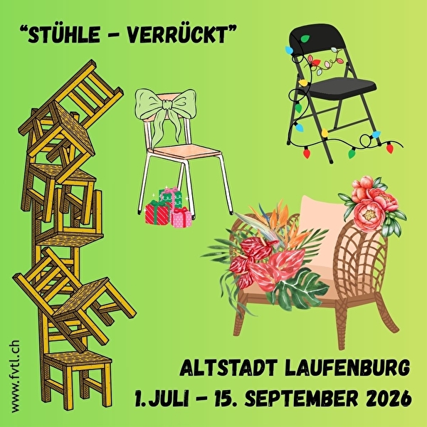 Von 1. Juli bis 15. September 2026 werden fantasievoll gestaltete Stühle oder kleine Kunstwerke aus Stühlen in der gesamten Altstadt von Laufenburg, auf beiden Seiten des Rheins, zu sehen sein. Auch dieses Jahr lädt der FVTL Einheimische und Gäste gleichermassen dazu ein, unsere historischen Gassen neu zu erleben. Wir sind noch auf der Suche nach kreativen Mitwirkenden, die bei diesem Stuhlprojekt mitmachen, damit wir möglichst viele Stühle präsentieren können. Wer Zeit, Lust und das richtige kreative Händchen dazu hat, darf sich gerne bei unserem Vorstandsmitglied Jutta Leuenberger melden (jutta.leuenberger@fvtl.ch, +41 (0)79 574 75 91).